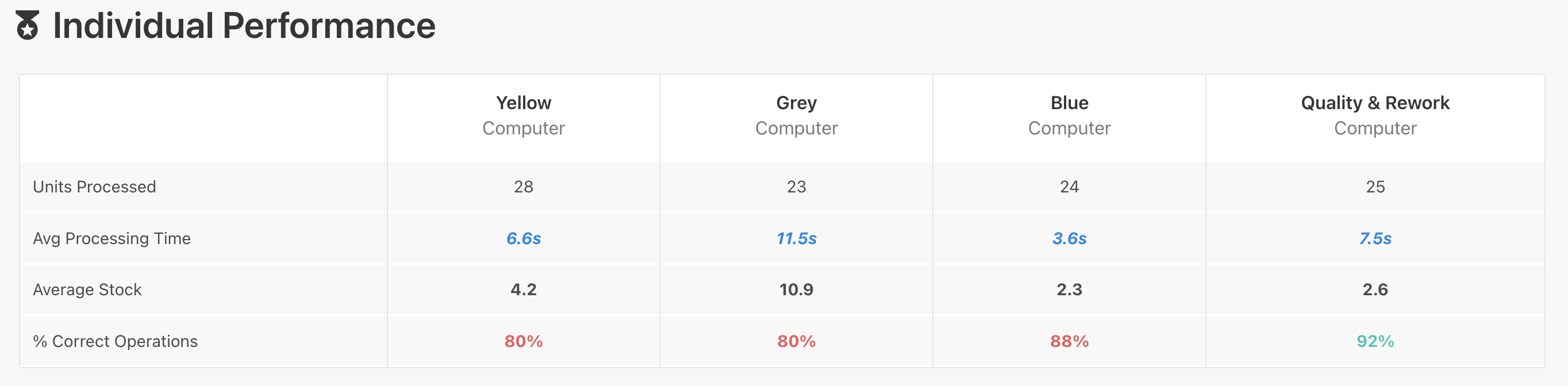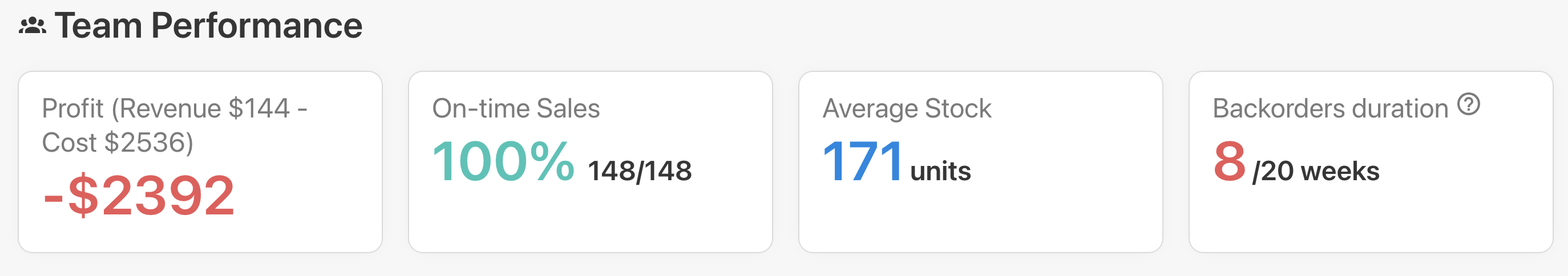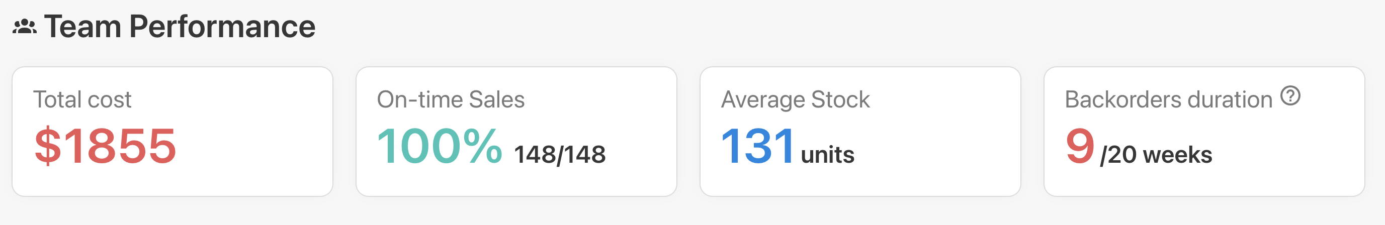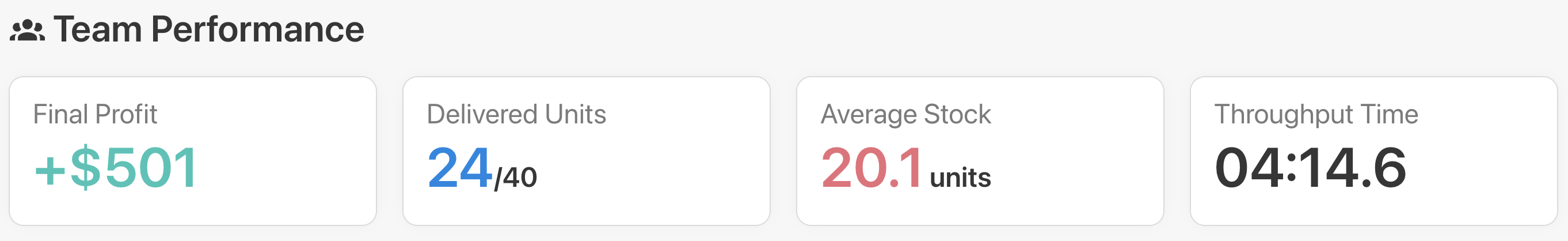 Here are the KPIs for the whole workshop displayed to players after they finish a game: