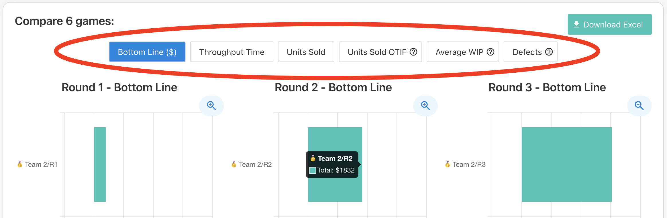 Multiple metrics can be compared between teams/rounds from the Session Results page: